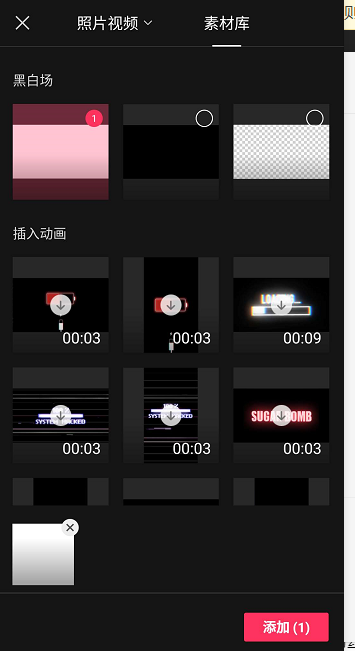 2、点击素材库,然后选择黑屏的素材添加即可。