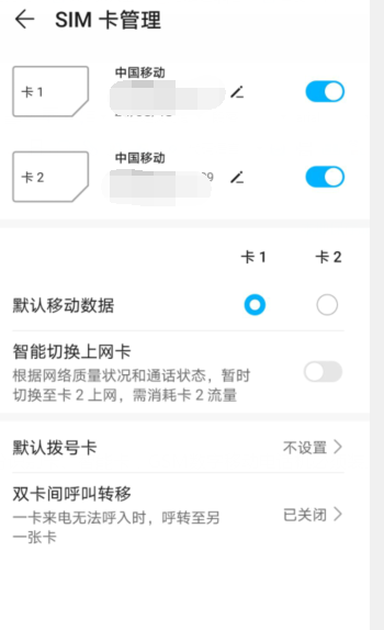 3、进入后可设置切换上网卡、默认拨号卡、双卡呼叫转移进行设置。