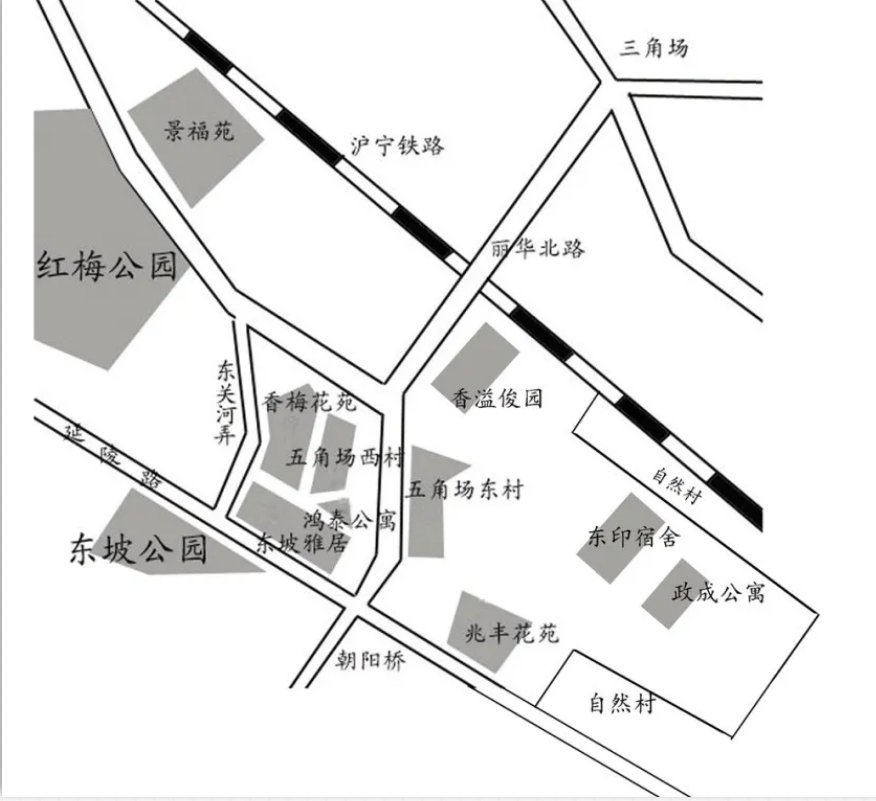 景福苑(1-13)、东坡雅居(1-9)、香梅花园(1-10、12、13)、五角场西村(1-4、7-16、19-21)、鸿泰公寓(1)、五角场东村(1-10、13-19)、兆丰花苑(5-12、14-37)、政成公寓、东印宿舍(1(1)、1(2)、1(10))、曹达村(36-168)、高家弄(1-38、80)、许家村(1-53)、东头村(1-101)、焦家村(1-68)、曹家弄、郑家场、严家村、香溢俊园(1-3、5-10)、月馨苑(2-4、7-10)。