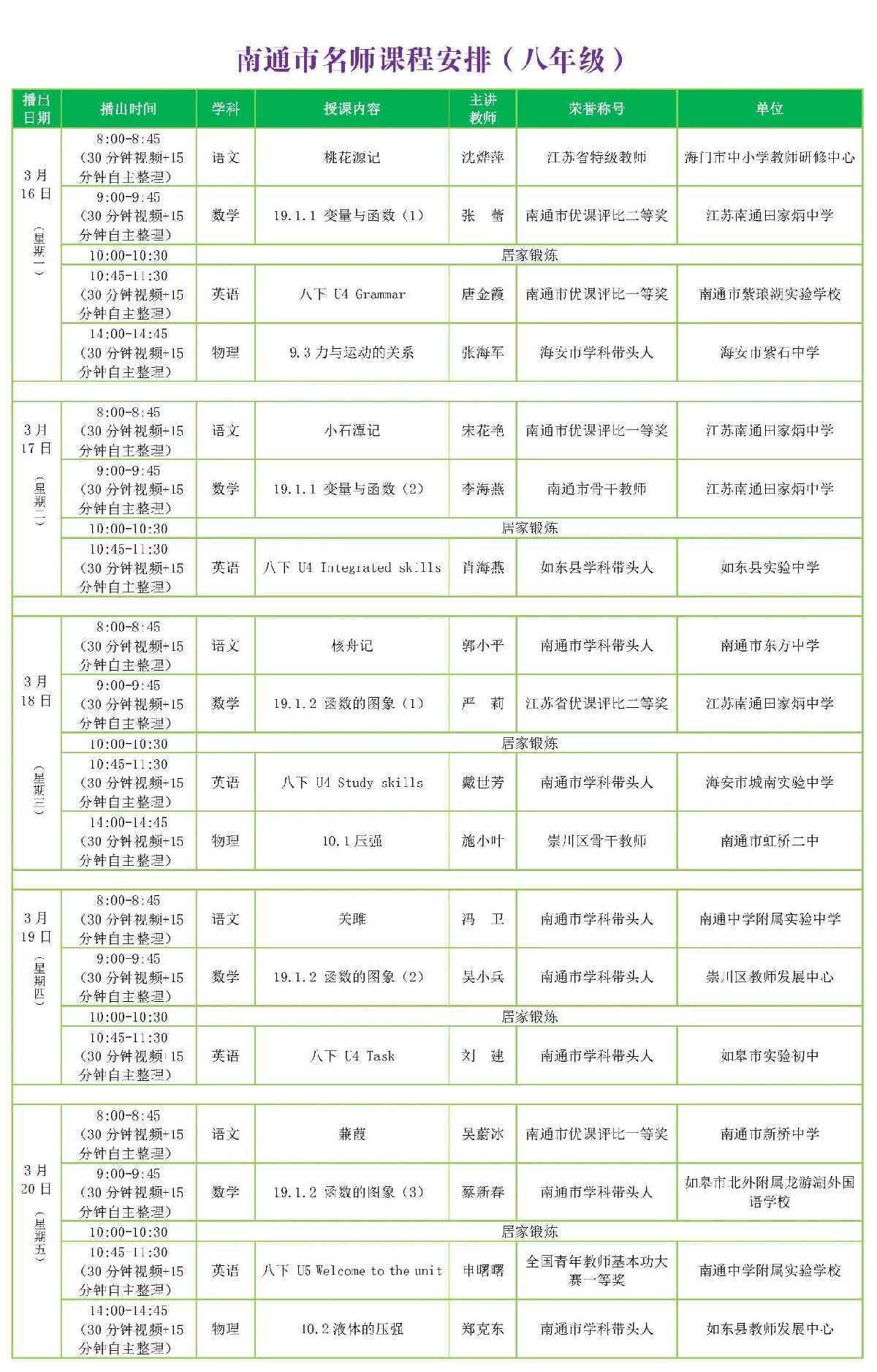 12日,市教育局发布公告,宣布南通市延迟开学期间第六期(3月16日—20日)线上答疑、心理辅导和课程安排。