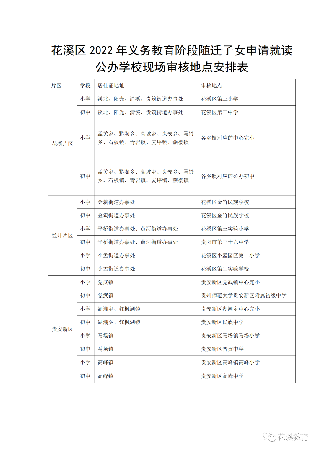 一、花溪区2022年义教阶段随迁子女申请就读公办学校现场审核地点安排表