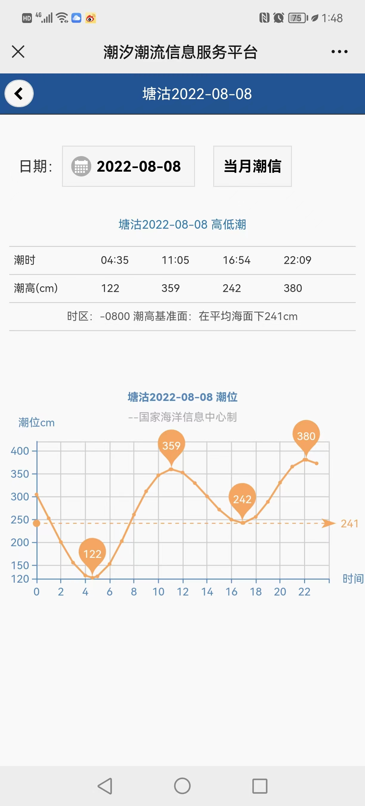 1、点击查询入口进入后,即可看到当日高低潮潮时和潮高,还可看到当日潮位图;想要查询其他时间高低潮潮时、潮高、潮位图,点击日期,进行选择即可;(注意:最久能查询到半个月以内的潮汐信息!)