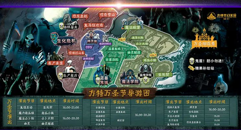 ☑惊喜一:四大全新鬼域:魔法学院、盗茎鬼城、精灵国、生化危机惊险再现!超多万圣限定项目等你打卡!