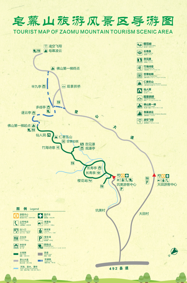 A:坑美入口--樱花峪--长寿亭--观瀑亭--佛山第一梯-逐云亭--多歧亭-半九亭--山顶观景平台(参观完毕需原路返回)。