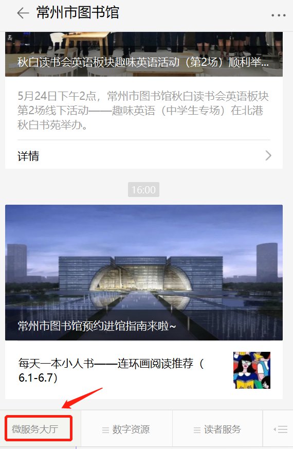 预约入口2:常州市图书馆微信公众号,点击微服务大厅进入预约页面