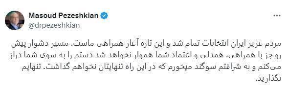 他说:“亲爱的伊朗人民,选举已经结束,这是我们伙伴关系的开始。如果没有你们的陪伴、支持、信任,前方的艰难道路无法一帆风顺。我向你们伸出我的手,并以我的名誉起誓,在这条路上我不会让你们孤单,也请不要让我孤单。”
