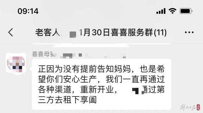 可谁知,2024年1月22日,梁先生妻子准备待产,联系喜喜后却被告知,门店早在去年11月就已关闭。预订时组建的11人服务微信群中,该店的左姓老板,也是“上海喜喜母婴护理服务股份有限公司”的法人代表、董事长对于“悄悄关店”一事解释称,“没有提前告知妈妈是希望你们安心生产。”老板还称,他们一直在通过各种渠道重新开业。