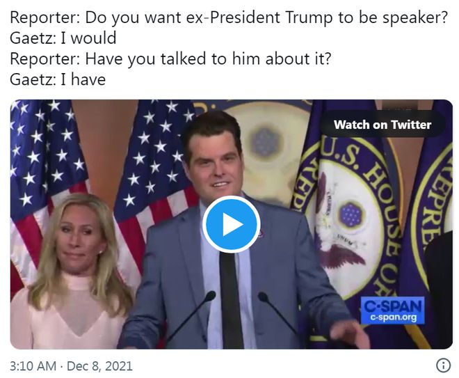 2021年7月,盖兹就曾在佛罗里达州的一次集会上承诺,在2022年中期选举后提名特朗普担任众议院议长,通过投票让特朗普重返政坛。