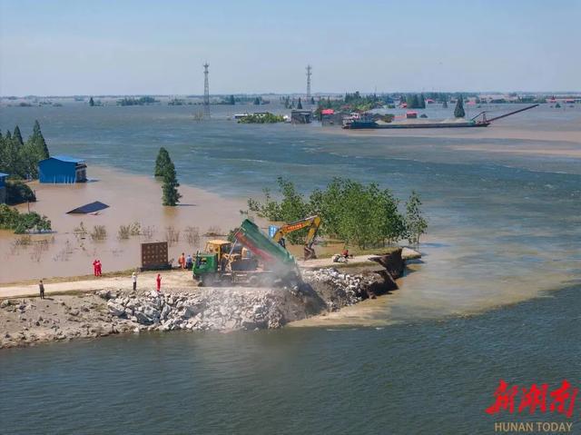 7月5日下午,湖南岳阳市华容县团洲乡团北村团洲垸洞庭湖一线堤防发生决口,现在封堵合龙工作正在紧张进行。