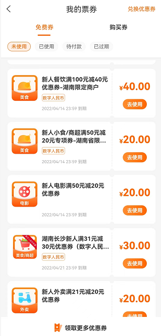 领券类型:消费券分为5档,分别为40元美食券(满100元使用)、20元外卖券(满21元使用)、20元商超券(满50元使用)、20元观影券(满50元使用)、30元数币专享券(满31元使用)。