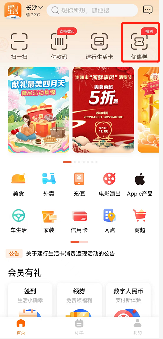 4月8日至4月30日期间,浏阳市“河畔季风”消费节将通过建行生活APP投放219万元电子消费券;浏阳河畔季风消费节活动期间,首次注册“建行生活”APP的用户,系统直接派发“新客专享”消费券,具体如下: