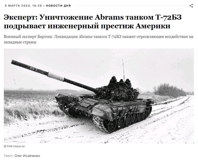 最近损失的第三辆M1A1坦克则是被T-72B3主战坦克击毁的。根据俄军战场指挥官的描述,“在这次坦克决斗中,T-72B3坦克的乘员第一击就摧毁了西方引以为豪的美国M1A1坦克。”俄罗斯英雄、空军少将谢尔盖·利波沃伊透露,这辆T-72B3坦克用穿甲弹击中了M1A1坦克的薄弱部位——发动机舱,因为这里缺乏防护,并且处在车体和炮塔之间的部位,“一旦击中它,就会把炮塔掀掉”。