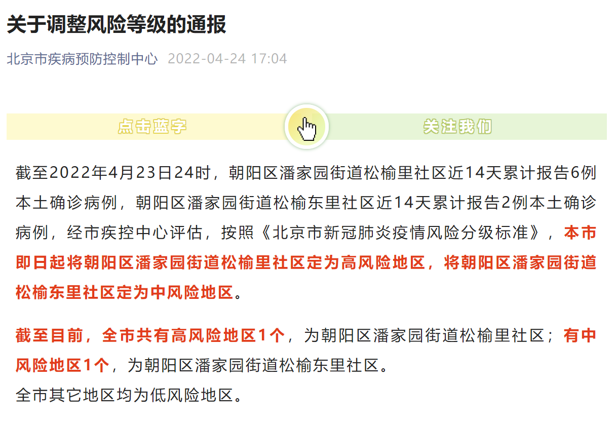 通知内容:截至2022年4月23日24时,朝阳区潘家园街道松榆里社区近14天累计报告6例本土确诊病例,朝阳区潘家园街道松榆东里社区近14天累计报告2例本土确诊病例,经市疾控中心评估,按照《北京市新冠肺炎疫情风险分级标准》,本市即日起将朝阳区潘家园街道松榆里社区定为高风险地区,将朝阳区潘家园街道松榆东里社区定为中风险地区。