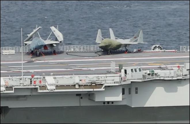 辽宁舰此次出海时,飞行甲板上搭载有歼-35和歼-15的模型