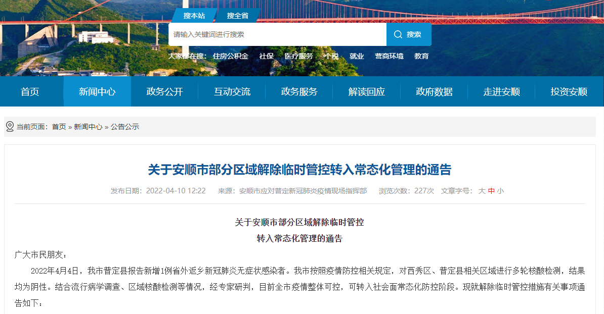 关于安顺市部分区域解除临时管控转入常态化管理的通告(2022年4月10日发布)
