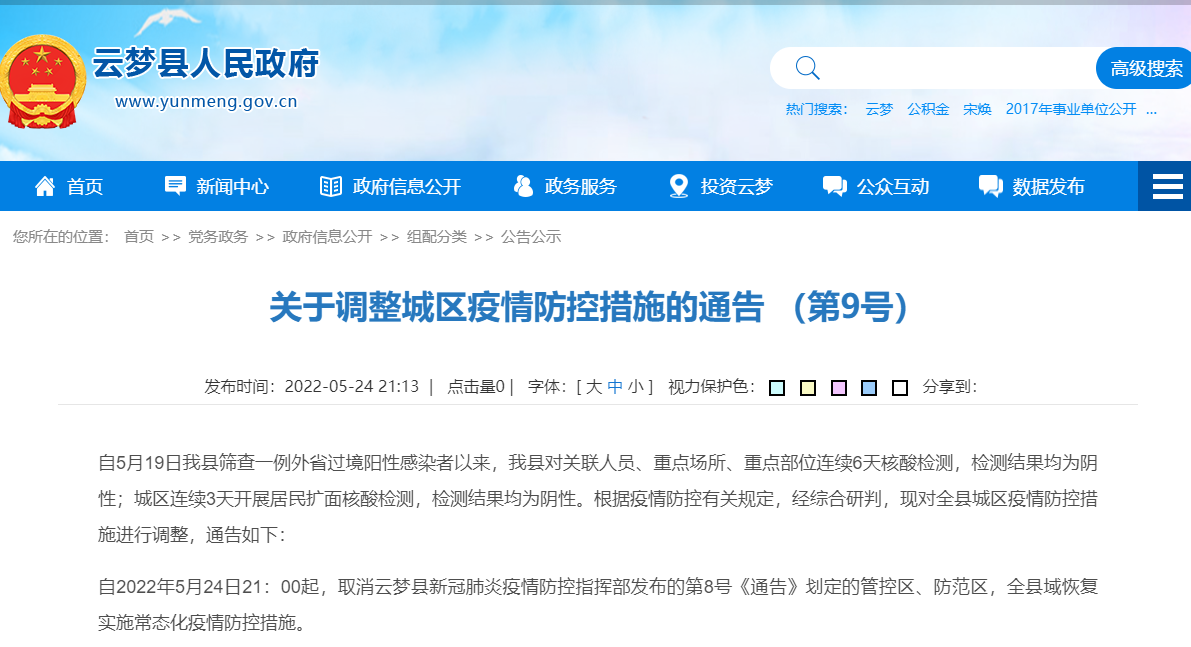 自2022年5月24日21:00起,取消云梦县新冠肺炎疫情防控指挥部发布的第8号《通告》划定的管控区、防范区,全县域恢复实施常态化疫情防控措施。