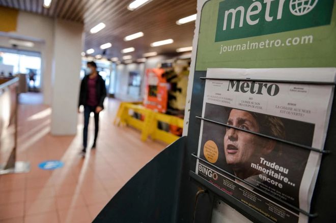 ▲在加拿大蒙特利尔一地铁站内拍摄的印有加拿大总理特鲁多照片的报纸。新华社/法新