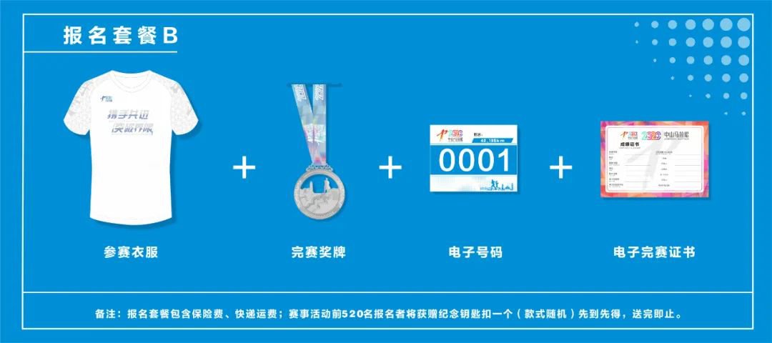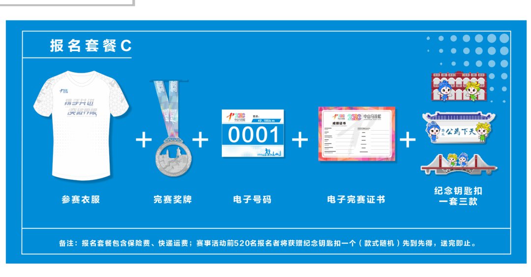 完赛奖牌+完赛纪念服+纪念钥匙扣一套+电子号码布+完赛电子证书+活动保险+快递运费