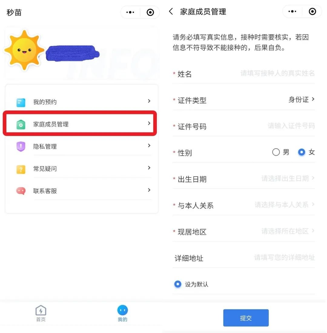 4、先点击【我的—家庭成员管理】完善个人信息(已填写过的用户可忽略此步骤)