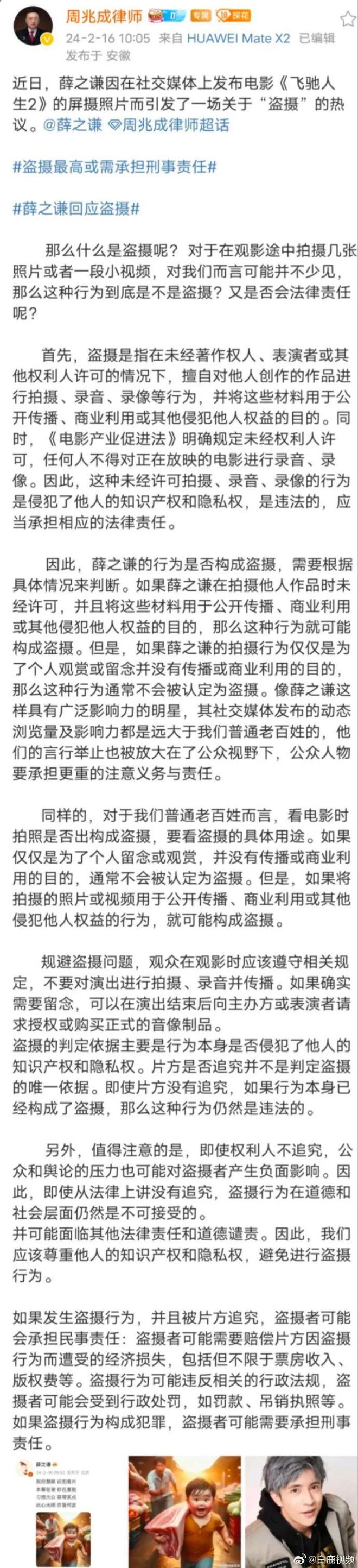 今天(16日),周兆成律师发文详细解读了薛之谦被指盗摄之风波。