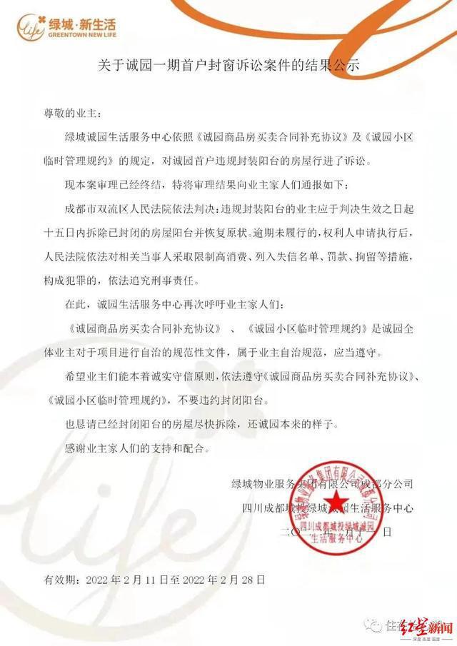 去年2月,成都绿城·诚园一期小区物业发出的一纸告示在网络引发热议。物业在针对小区一封阳台业主的诉讼中获胜,业主被一审法院判决限期拆除封闭的阳台。