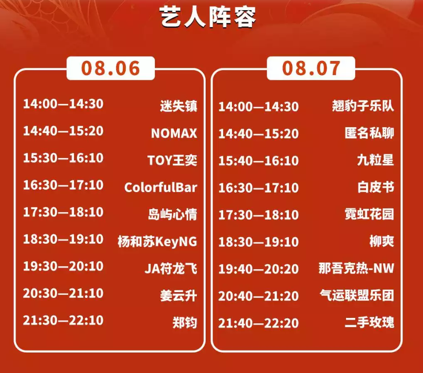 迷失镇 翘豹子乐队 NOMAX 匿名私聊 王奕 九粒星 ColorfulBar 白皮书 岛屿心情 霓虹花园 杨和苏KeyNG 柳爽 JA符龙飞 那吾克热-NW 姜云升 气运联盟乐团 郑钧 二手玫瑰。