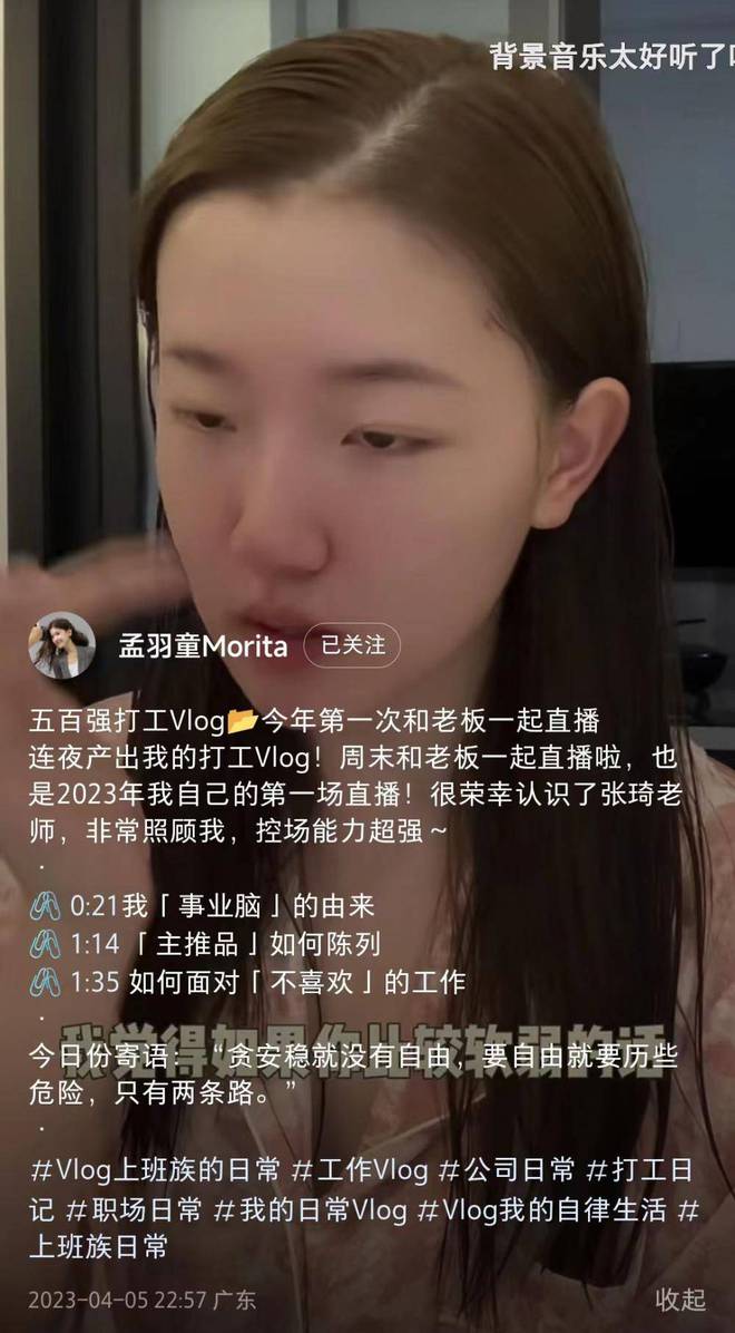 4月5日晚,孟羽童小红书账号“孟羽童Morita”发布了一条动态,文字介绍中写道:“今年第一次和老板一起直播……也是2023年我自己的第一场直播!”而在剪辑的视频开头,正是一段她与格力电器董事长兼总裁董明珠一起直播的画面,画面中孟羽童笑容可掬状态很好地与董事长进行着互动。