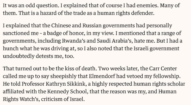 可另一方面,罗斯和他的支持者并没有因为这种“审查”,就宣布与哈佛决裂。他们反而是在媒体上澄清起了罗斯和“人权观察”组织对以色列的那些批评,急切地想要说明罗斯并不是“反以色列”的。