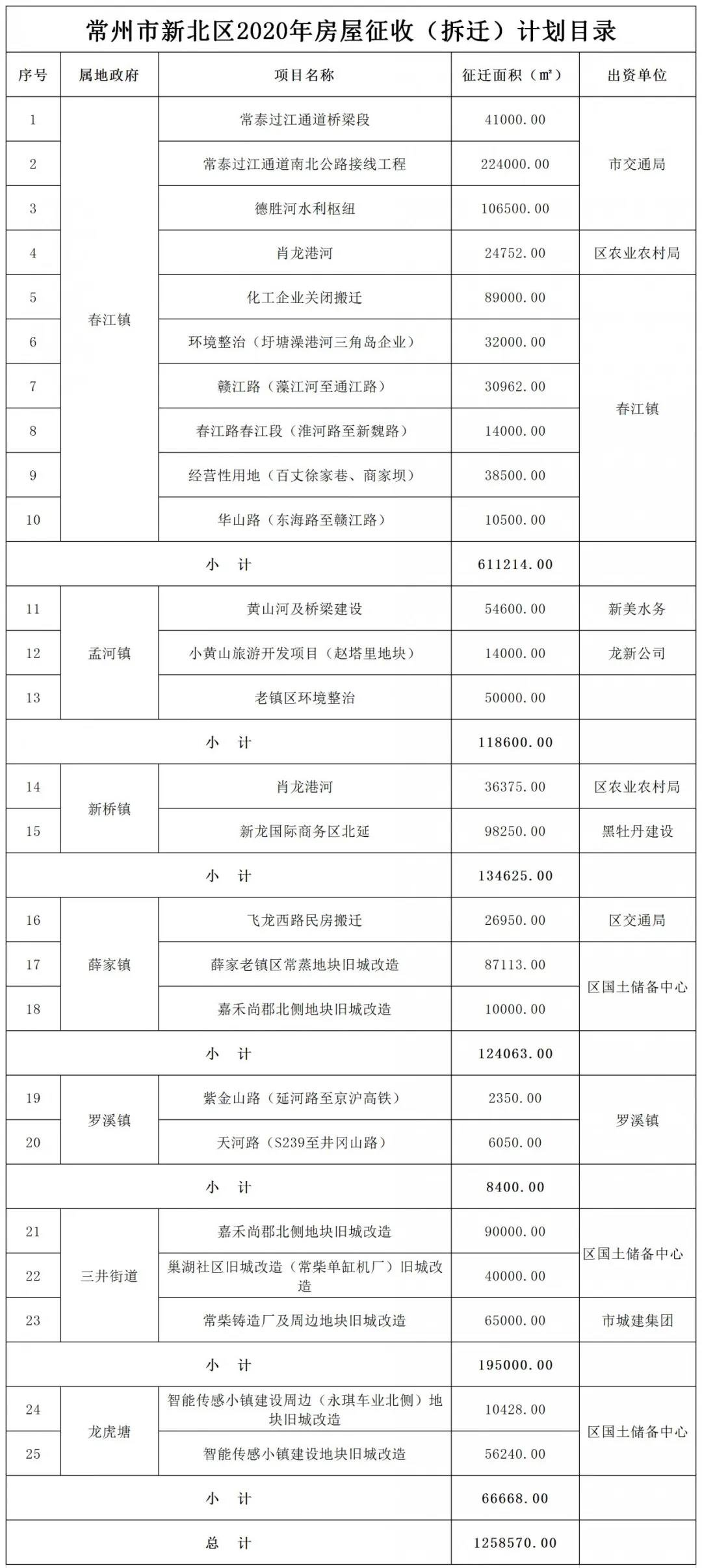 目录包含了春江镇、孟河镇、新桥镇、薛家镇、罗溪镇、三井街道和龙虎塘25个项目,征迁面积1258570㎡