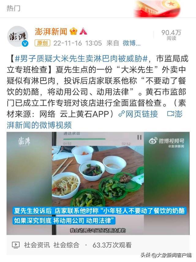 男子点大米先生外卖吃到疑似淋巴肉,被威胁“不要动餐饮奶酪”,最新进展来了……