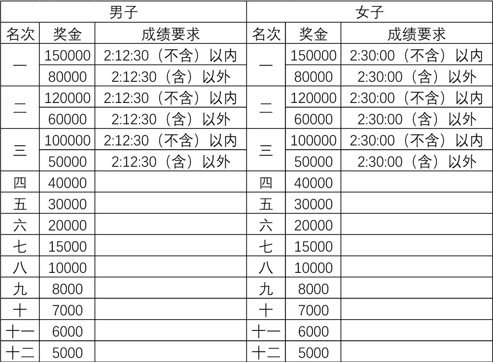 (2)奖励标准:马拉松成绩达到如下要求,将分别获得奖金如下(单位:人民币)。