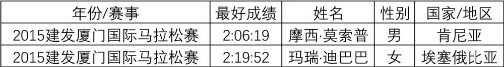 按枪声成绩录取:破厦门马拉松赛(男、女)最好成绩,奖励3万美元。