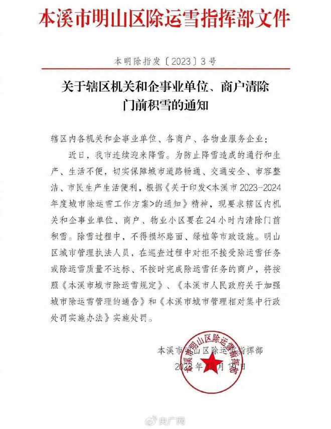 对于通知内容及除雪有关问题,记者联系了明山区住建局及本溪市住建局,均被告知需要由宣传部门进行回复。