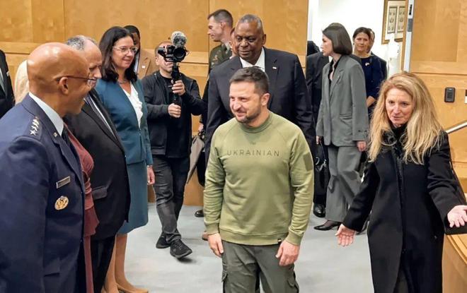 泽连斯基抵美,与美国国防部长奥斯汀(左)等人会面