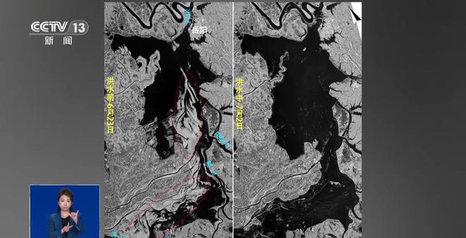 洞庭湖雷达影像显示,左图为6月23日拍摄的洪水前影像,右图为7月2日拍摄的正在发洪水的影像。右图中黑色区域为洪水覆盖区域。对比可以发现洪水前影像中,大片陆地已被洪水淹没,沅江入湖处细长河道,在7月2日影像中已成为洞庭湖的一部分。