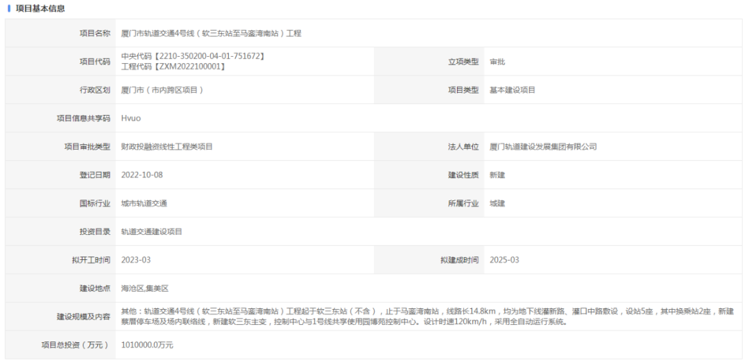 厦门地铁4号线传来最新进展(软三东站至马銮湾南站)工程立项审批,总投101亿,预计明年3月开建,2025年建成,设站5座,其中换乘站2座。