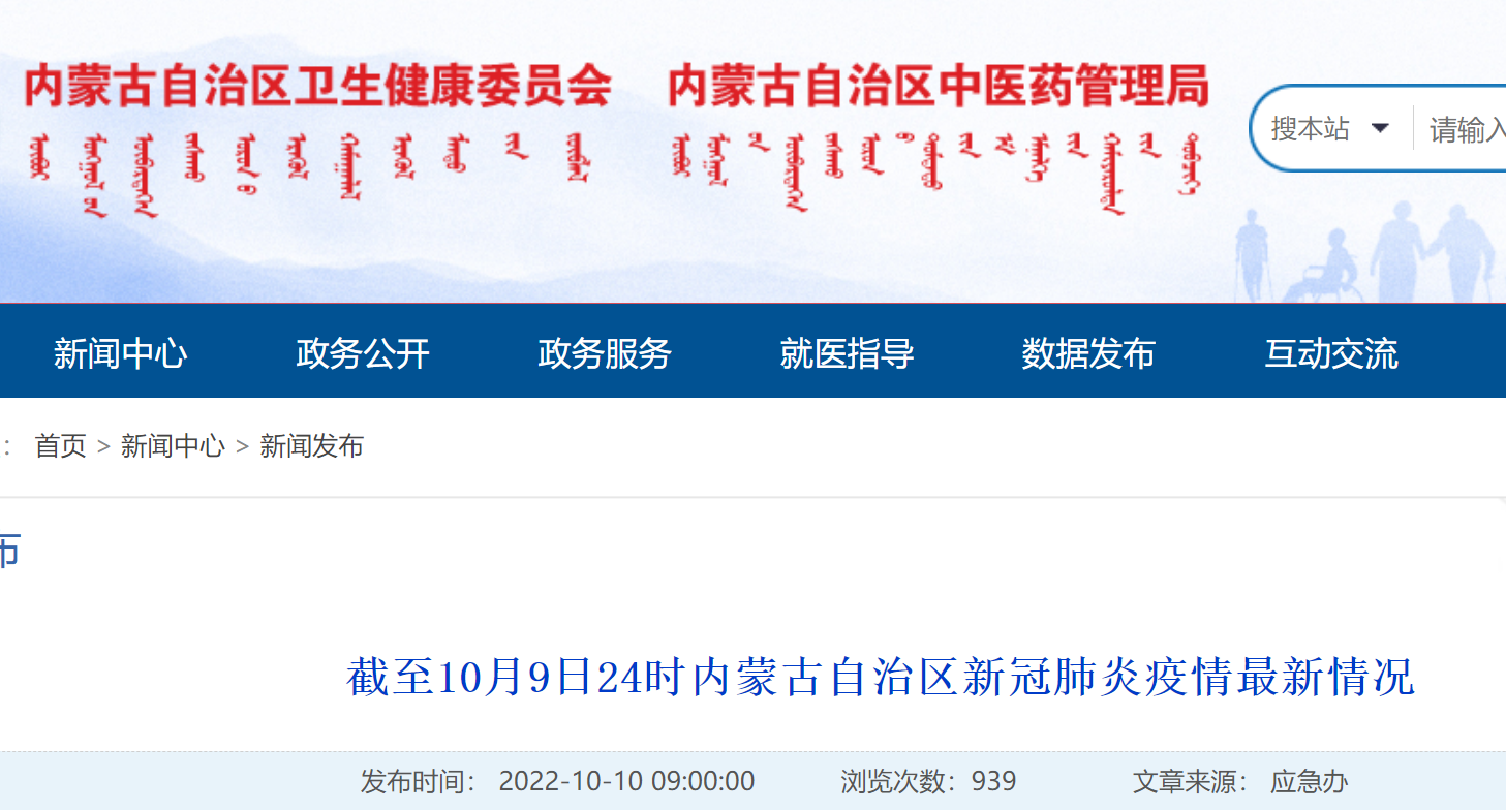 截至10月9日24时内蒙古疫情数据
