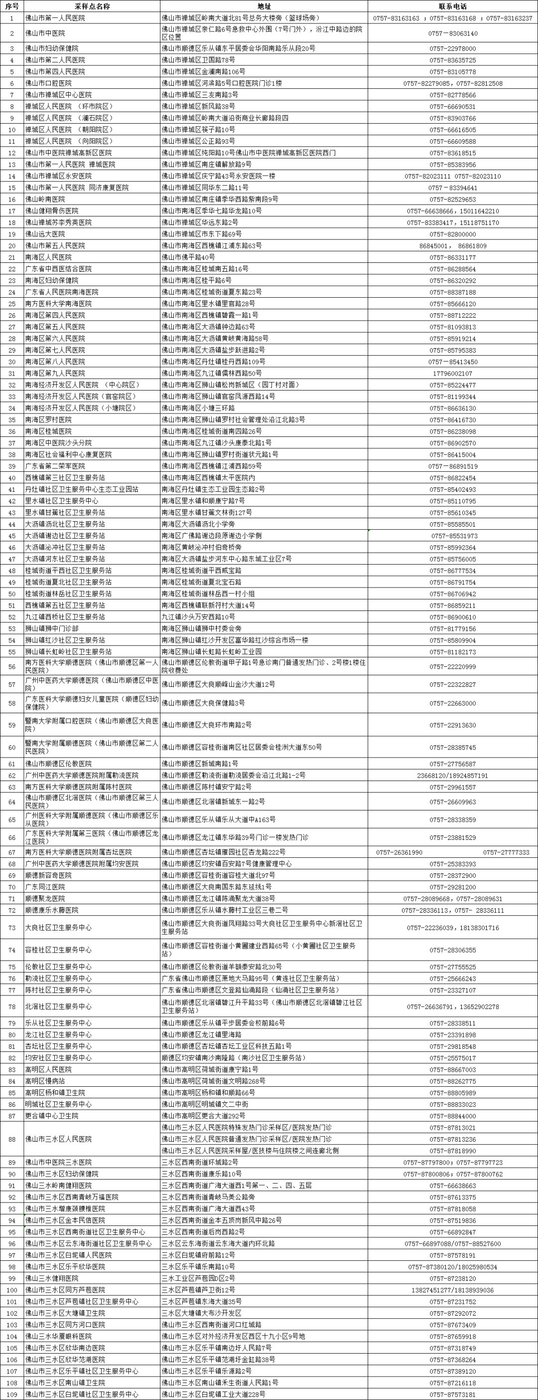 疫情中风险地区来佛人员专门核酸采样点(地址+电话)