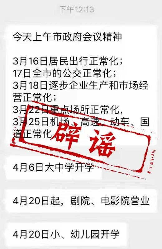 经核实,近日在网络上流传的这条“今天上午市政府会议精神,3月16日居民出行正常化、4月6日大中学开学、4月20日小幼儿园开学……”的信息是假的。