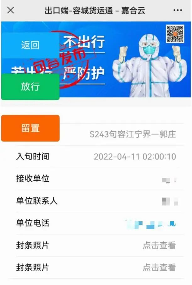 (四)查验流程。抵达入句查验点后,现场工作人员会扫描通行证二维码进行查验。托运人(物资接收单位)应提前抵达查验点等候接收。如符合条件,则放行,否则劝返。放行或劝返后,“我的申报”里相应条目上将显示提示章。放行后,接收人员按要求引导司乘人员现场进行核酸采样,张贴驾驶室封条,完成后,可拍摄上传封条张贴照片。