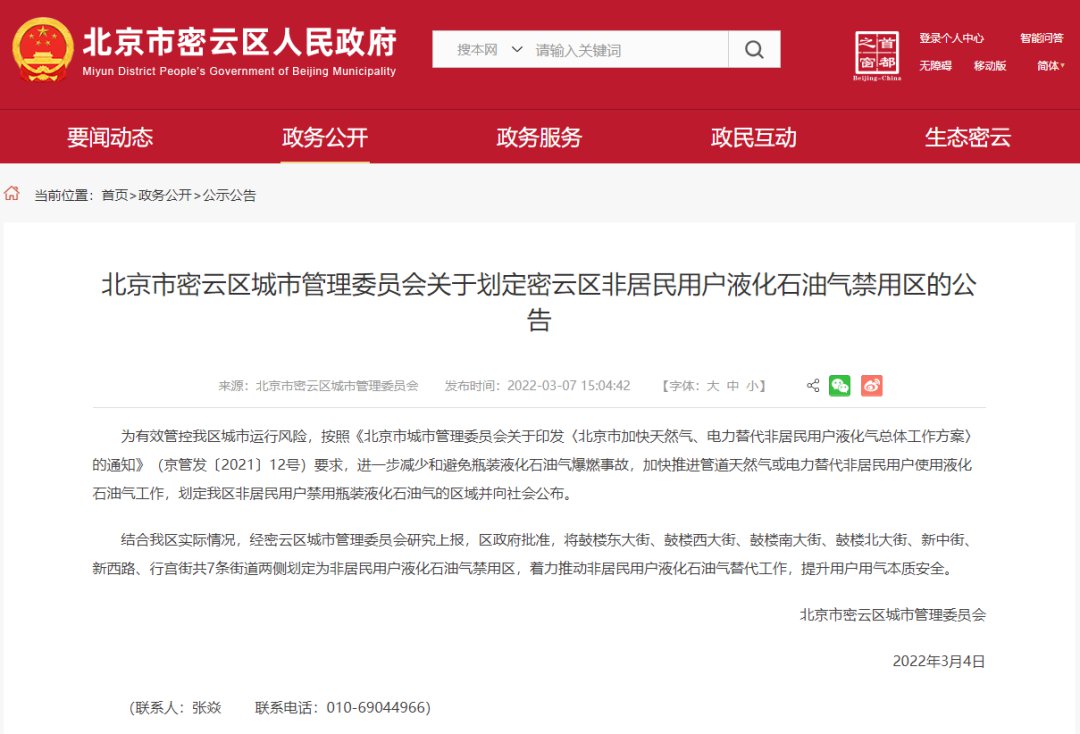 ➤密云这7条街道两侧划定为非居民用户液化石油气禁用区