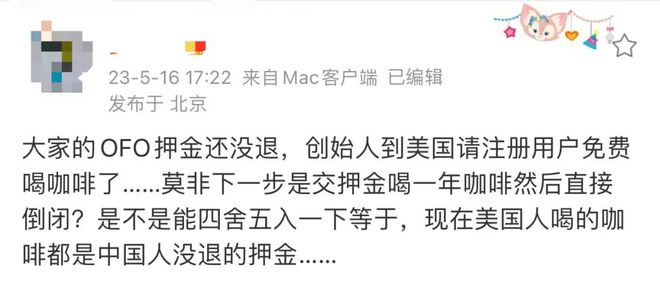 还有网友脑洞大开,既然About Time Coffee的一个营销点是免费请人喝咖啡,“四舍五入一下,现在美国用户喝的咖啡都是中国用户没退的押金?”