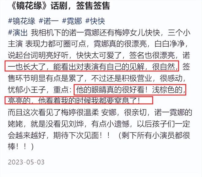 还有更早之前的《镜花缘》话剧签售活动,诺一也很大方给粉丝签名。偶遇者大赞其对表演有自己的简解,很自然,而且眼睛很好看。