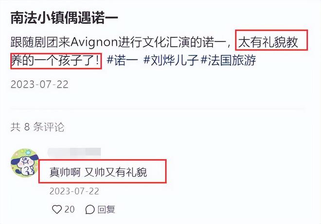 去年有网友在南法小镇偶遇诺一进行文化汇演,他不断和网友宣传手上的表演,还配合拍照,被赞“太有礼貌教养”。
