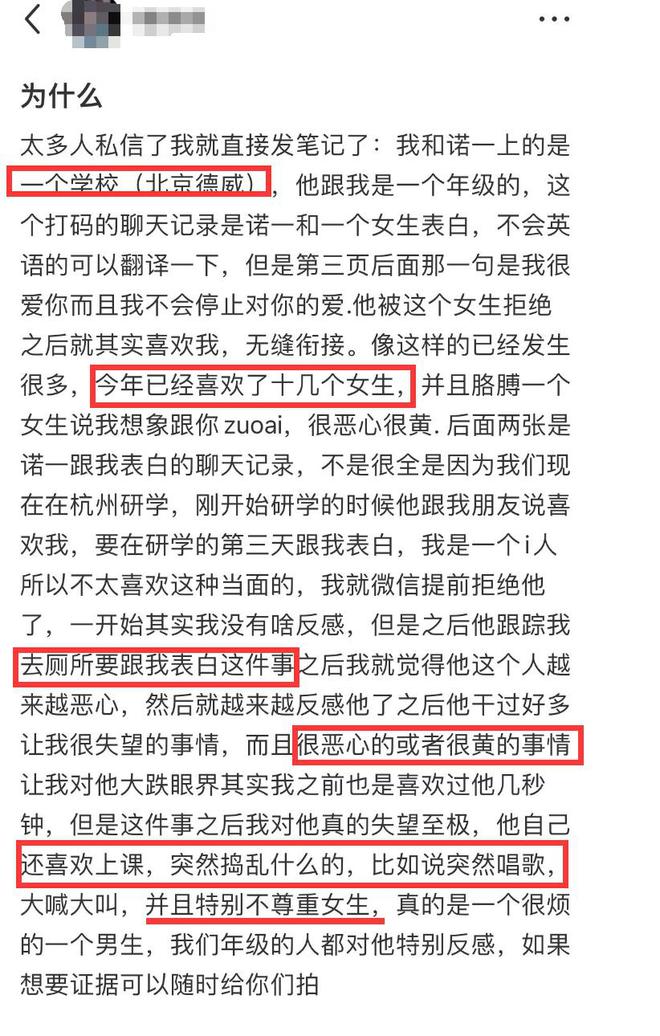 该网友表示目前大家都在杭州研学,刚开始研学时,诺一就和他朋友说要跟自己表白,自己便提前拒绝了他,没想到诺一追到女厕所和自己表白,让自己觉得恶心。