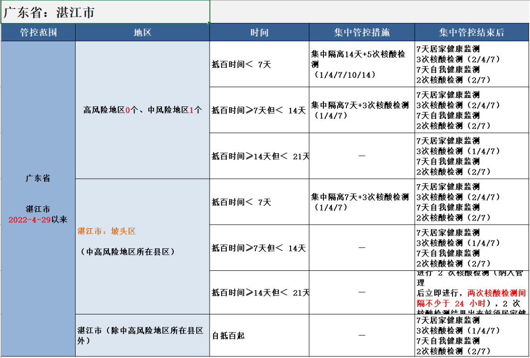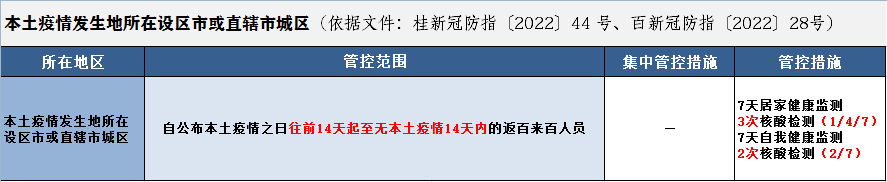 已由中高风险降至低风险的地区,该地区及所在县(市、区)或直辖市街道来桂返桂人员,实行7天自我健康监测+2次核酸检测。