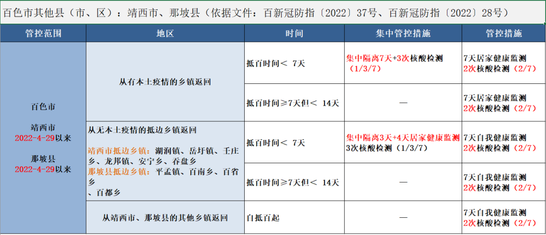 有以下地区旅居史,或与阳性感染者活动轨迹有交集的来(返)百色的市民,请提前 24 小时向目的地社区(村、屯)报备,在抵百后 12 小时内向目的地社区(村、屯)报告,纳入社区管理,并配合做好医学隔离观察或健康监测等健康管理工作。