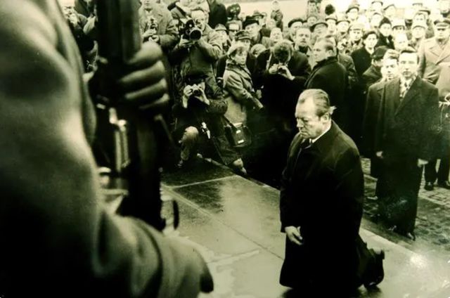 1970年12月7日,联邦德国总理勃兰特在波兰首都华沙犹太殉难者纪念碑前下跪,代表德国请求得到战争受害者的宽恕。图/新华社发