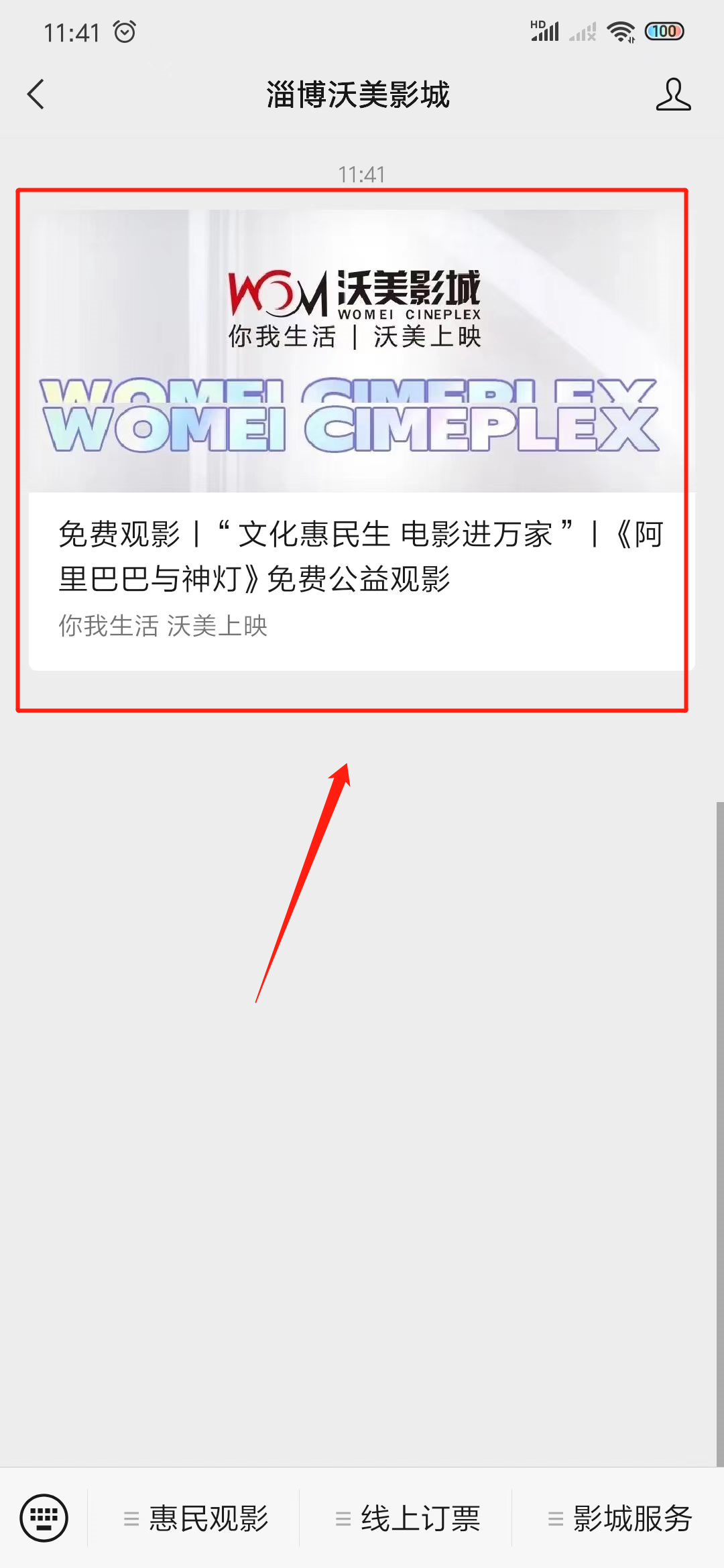 第一步:关注有放映公益电影的影城公众号,小编以在张店区的淄博沃美影城为例。