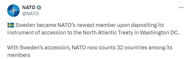 财联社3月8日讯(编辑 牛占林)当地时间周四,瑞典正式加入了北约(NATO),成为其第32个成员国,距瑞典首次申请加入该军事联盟已过去了近两年时间。